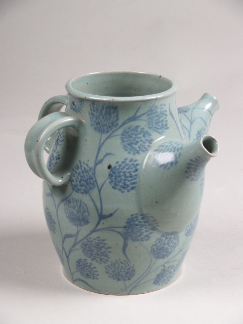 Kan met 2 tuiten en 2 oren, volgens toelichting bedoeld voor jubilerende paren om gezamenlijk uit te drinken bij wijze van 'toost'. Kan is aan binnen- en buitenzijde overdekt met een lichtgroen/turquoise celadonglazuur met daarover in blauw een bloem/plant decor