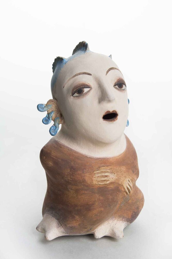 Beeld voorstellende een zittende vrouwfiguur met opengesperde mond, blauw haar, 3 oorbellen per oor en een bruine jurk.