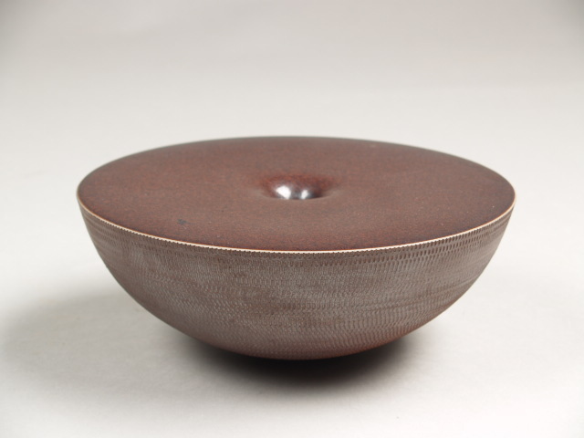 Bruine vaas in de vorm van een gehalveerde bol, met gat van circa 1 cm. in het vlakke bovenvlak. De zijkanten zijn ruw doordat zij zijn ingekerfd (met koord,draad?) met een patroon van streepjes. Door het glazuur schemert een blauw-groen onderglazuur. De bovenkant is overdekt met een zijde bruin glazuur met zwarte spikkels.