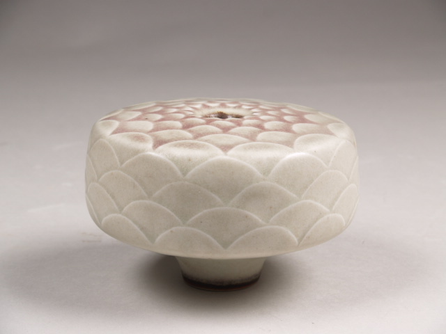 Vaas in de vorm van een artisjok, mat, zachtgoen en paars glazuur