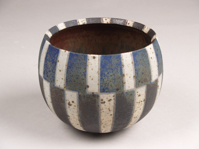 Komvorm, met dikke (1 cm.), bolle wand. Interieur bedekt met matte bruine en antraciet kleurige loopglazuren. Buitenzijde wand voor zien van een gekaderde decoratie van crèmekleurige en blauw/groene rechthoekige vlakken, die boven de buik verspringen. De pot is van bruine erts spikkels