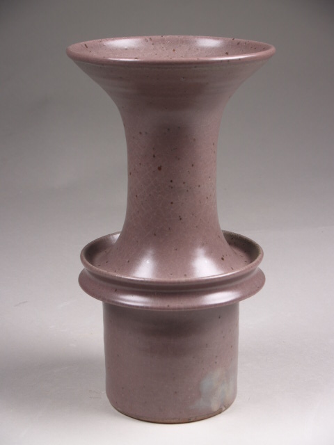 Vaas met rechte basis, uitgaande ribbels en lange kelkvormige hals. Overdekt met taupe kleurig craquelé glazuur met bruine spikkels aan binnen- en buitenzijde.