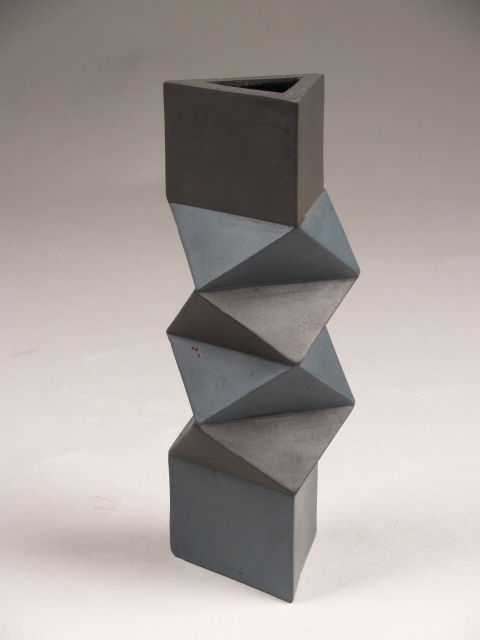 Vaas met driehoekige basis en hals. De wand is vormgegeven in de vorm van een ‘muizentrapje’ (refererend aan vlechtwerk): naar binnen- en buiten wijkende driehoeken van matte ingekleurde klei in zwart en donkergroen. Glanzend interieur.