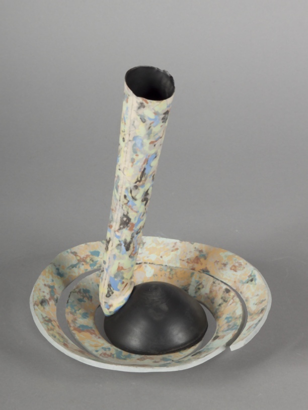Geabstraheerde kop en schotel uit één stuk, met polychroom decor, bestaande uit een spiraalvormige schotel en een trechtervormige kop.