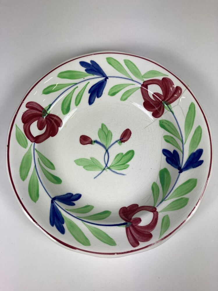 Diep bord met een licht geschupte rand, gedecoreerd met een Boerenbontmotief in de kleuren rodd, groen en blauw. In tegenstelling tot decor 021 zijn de kleuren rood en blauw in de bladrand omgedraaid.