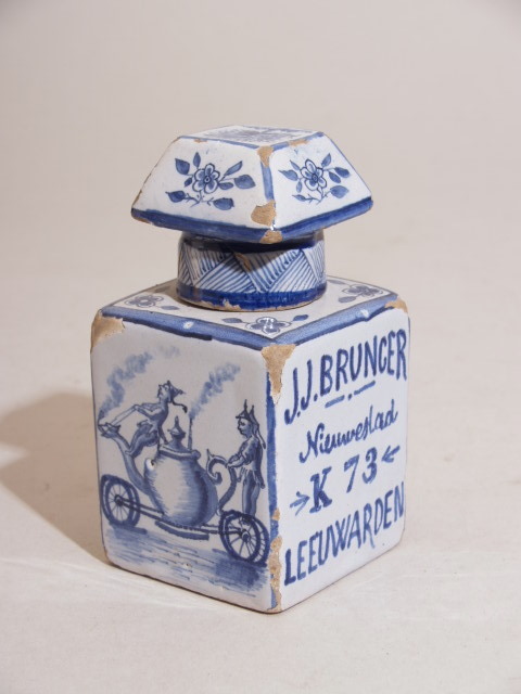 Theebus met decor van theepot en opschrift