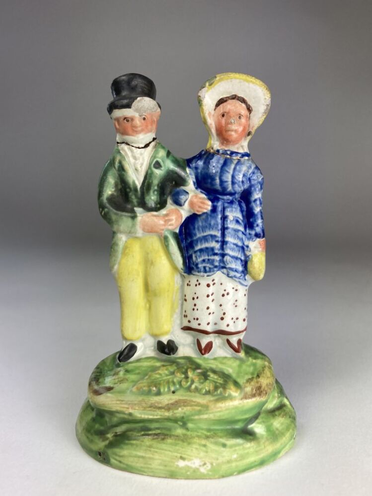 hol, ovaal voetstuk waarop man en vrouw gearmd, 19de eeuwse dracht. Materiaal: porselinachtige aardewerk met wit glazuur en emailkleuren in groen, rood, blauw, geel en zwart.