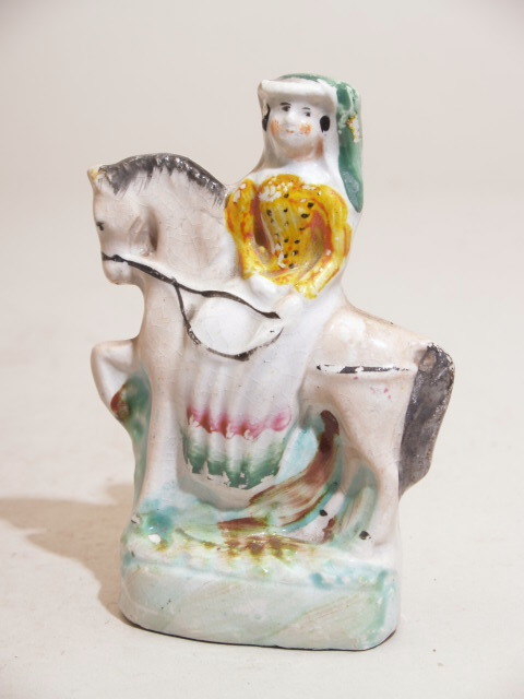 hil gegoten. Concave bodem met centraal gaatje. Op 2 cm hoog voetstuk vrouwtje schrijlings te paard. Materiaal: simili-porselein met emailkleuren. Keersijde vlak en ongekleurd.