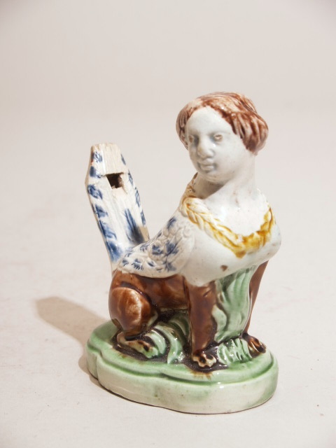 Concave bodem met ovale, viermaal ingesnoerde pseudo voetring. Op het plateau een sfinxachtig wezen met hondenlij, vogelstaart en vleugels, vrouwelijke boezem en vrouwehoofd. De opstaande staart vormt een fluitje. Materiaal: steengoedachtig aardewerk met glazuur in crême, groen, bruin, geel en blauw.