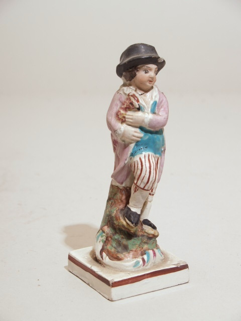 hol gegoten rechte bodem, recht spreidend naar pseudovoetring van vierkant plateau waarop tegen boomstronk jongetje met hoed en papegaai on der de arm. Materiaal: grijs aardewerk met crême glazuur en emailkleuren.