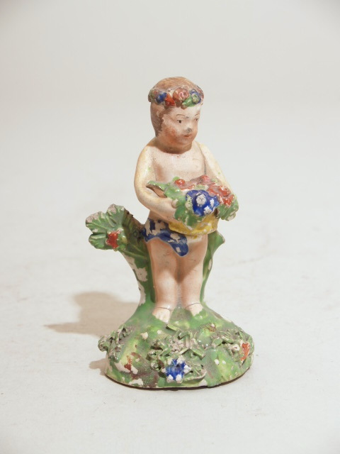 Concave bodem. Op het aldus gevormde voetstuk tegen een boomstronk een naakt kereltje, geslacht door de tip van een sjerp bedekt, bloemenkransje om het hoofd, mandje met bloemen in de handen. Materiaal: grijs aardewerk met wit glazuur en emailkleuren.
