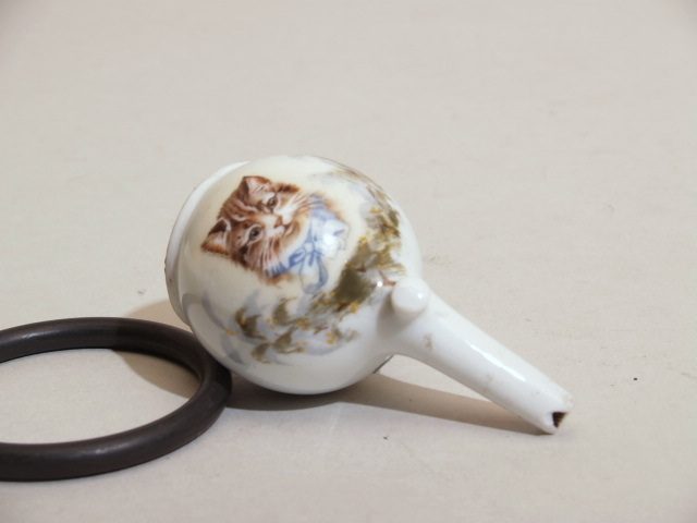 Een bolvormige pijpenkop van porselein, poychroom versierd met de voorstelling van een cypers poesje met witte bef en grote blauwe strik om de nek. Onder de voorstelling van de poes is de pijp gedecoreerd met een bloesemtak.