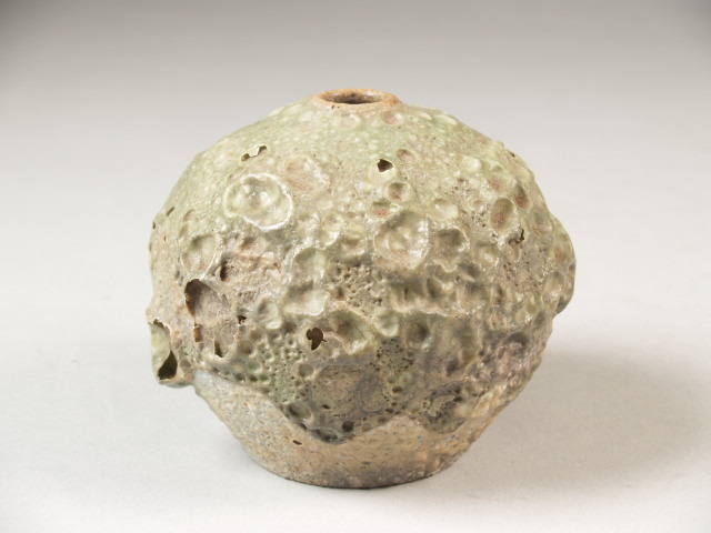 Vaas, bol met kleine opening, overdekt met dik celadon glazuur met blazen in glazuur