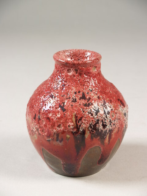 Vaas, bol met rechte hals, overdekt met roze/rood loopglaazuur over bruine ondergrond