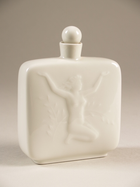 Fles met dop met in reliëf decor van zittende vrouw en opstijgende gans