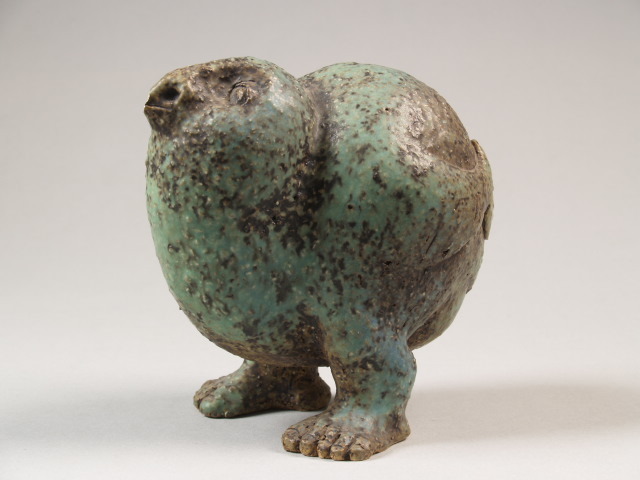Beeld van een vogelfiguur met menselijke voeten en handen.