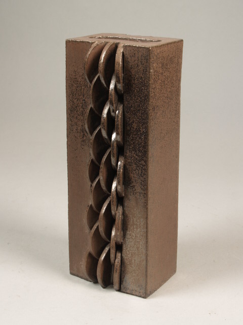 Rechthoekige vaas met opegewerkte verticale band in het midden, waaruit halve cirkelvormen steken. Koper/bruin geglazuurd