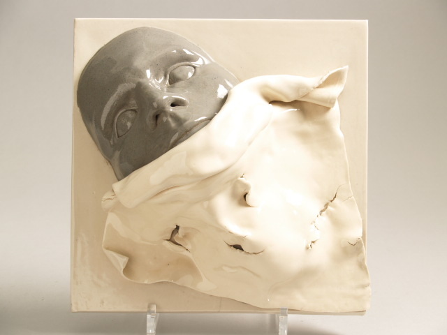 Beeld met een liggende onderplaat, waarop een masker bedekt met een doek ligt. Masker is grijs geglazuurd, overig transparant glazuur.