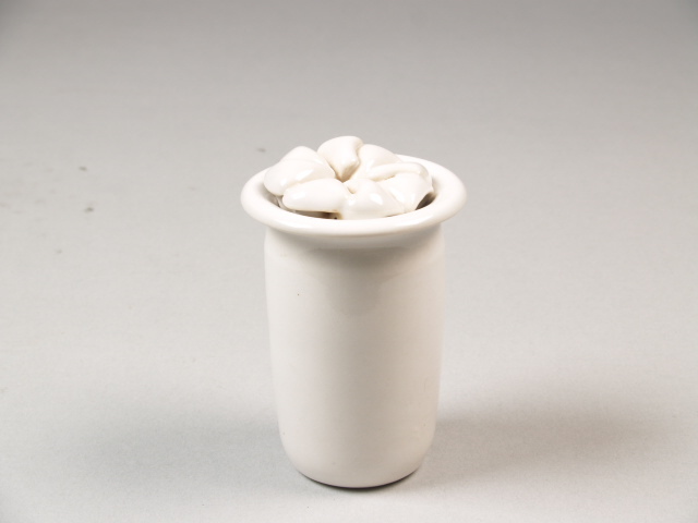 Hoge pot met deksel overdekt met wit glazuur. Bloemvormig gevormd deksel met openingen aan de zijkant