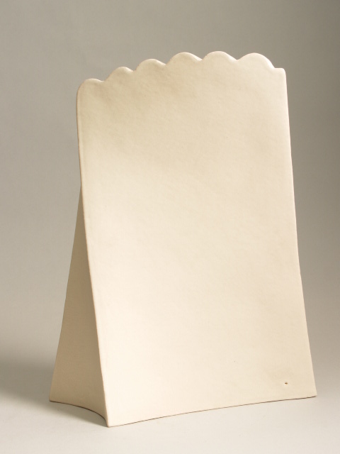 Rechte bodem in driehoekvorm waaop met een lichte draai de wand verticaal oprijst; bovenzijde zesmaal geschulpt. Materiaal: wit aardewerk met wit glazuur.