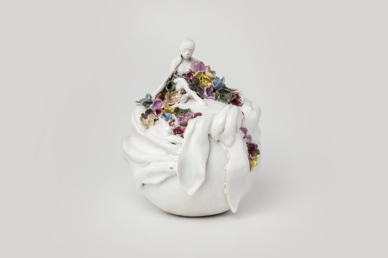 Beeld in de vorm van een bol met een grote strik en bovenop een vrouwenfiguur met polychrome bloemen.