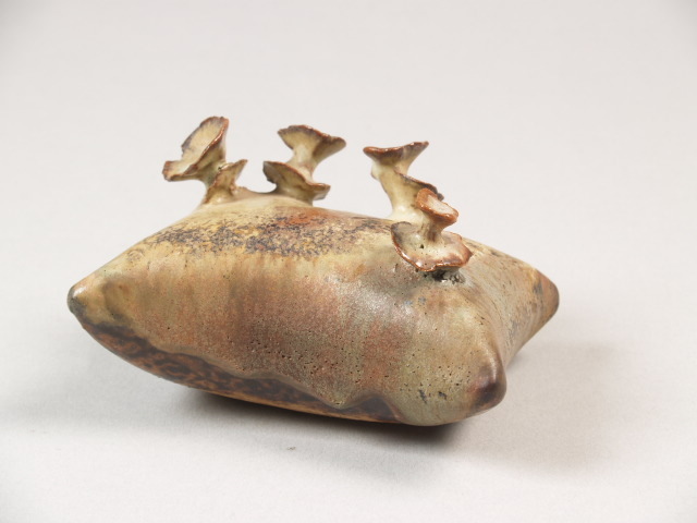 Langwerpig kussentje bezet met vier paddestoel vorm. Materiaal: lichtbruin aardewerk met olijfkleurig en bruin glazuur.