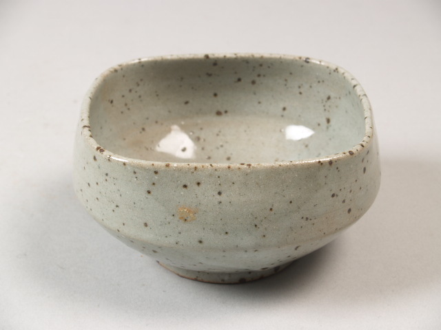Kom met vierkante wand met glanzend grijs glazuur met ijzerrode spikkels