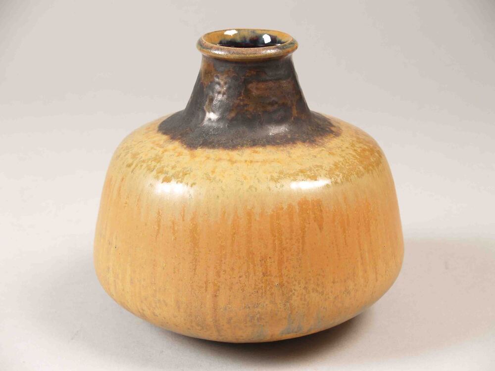 Vaas, bol met verhoogde hals, overdekt met bruin glazuur
