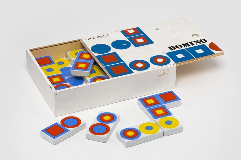 Dominospel bestaande uit 28 stenen met schildering van ronde en vierkante motieven in geel, rood en blauw, in houten doos met schuifdeksel