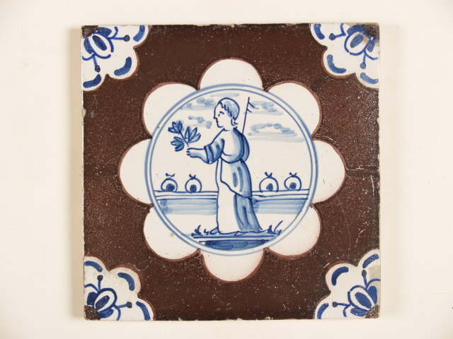 Tegel met blauwwit herdersdecor in een paars gesprenkelde omlijsting