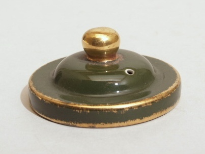 Ronde losse deksel van porselein, het oppervlakte is voorzien van een donkergroene grondkleur, de biezen en knop zijn verguld.