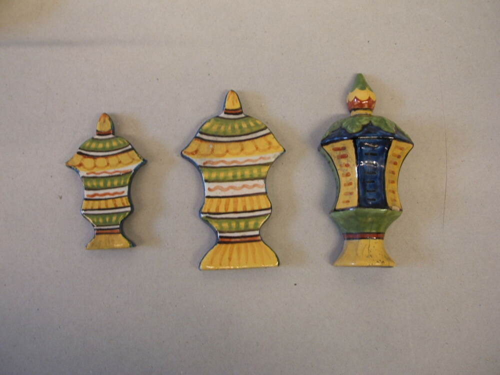 Ornamenten, twee plat en één 3-D. In een gestileerde vorm van een dekselvaas / dekselvaas en ook veelkleurig beschilderd als dekselvaas met simpel geometrisch decor. Het is niet duidelijk waarvoor deze ooit gemaakt zijn, mogelijk als toevoeging voor een klok of meubel. Onduidelijk, vermoedelijk niet in Makkum gemaakt maar van een andere fabriek (Delft ??)