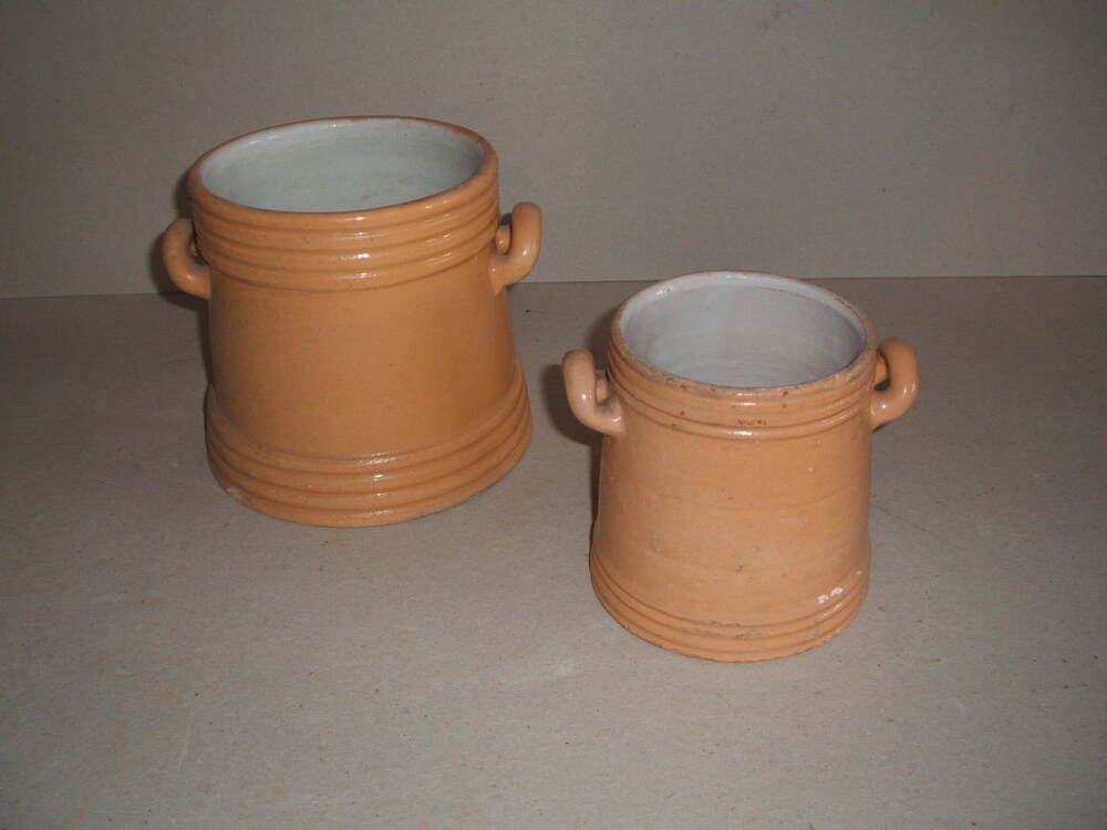 Voorraad vaten, met aan de binnenzijde een wit glazuur en aan de buitenzijde een oranje achtig glazuur. De vaten hebben boven- en onderaan een band van drie ribbels en vlak daaronder aan de bovenkant aan weerzijde een oor. De vaten lopen naar boven taps toe. De vaten zijn gemaakt in vijf of zes verschillende formaten ...