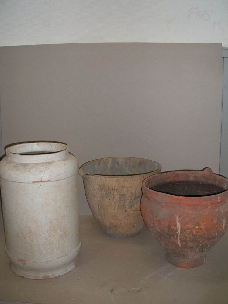 Voorraad potten voor natte glazuren en verf. Verschillende formaten en vormen. In deze collectie zijn er vier, twee dezelfde vorm met schekstuk in de rand en oren en twee afwijkende vormen (vermoedelijk werden potten zoals deze laatste twee toevallig gebruikt voor dit doel en zijn ze er niet speciaal voor gemaakt). Op de foto bij ...