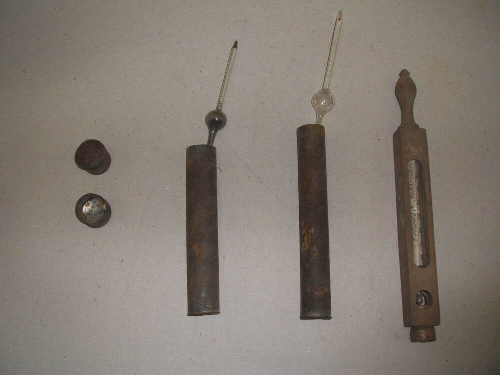 Twee areometers en een vloeistof thermometer. De areometers werden gebruikt voor het bepalen van het soortelijk gewicht in de glazuurpap in de pottenbakkerij. De goede dikte van het mengsel klei en loodmenie moest men weten om in één haal de goed dikte glazuur aan te kunnen brengen (m.b.v. het glazuur bad.).