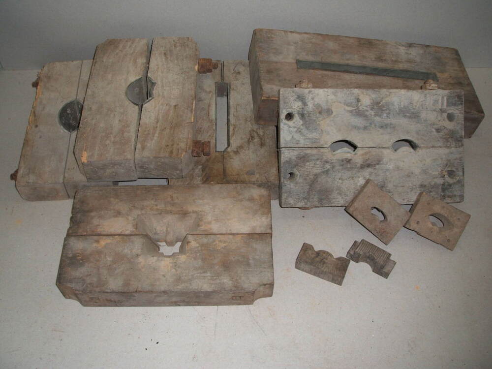 Mondstukken voor strengpers, met diverse vormen. Gebruikt voor het extruderen van tegels van verschillende doorsneden.