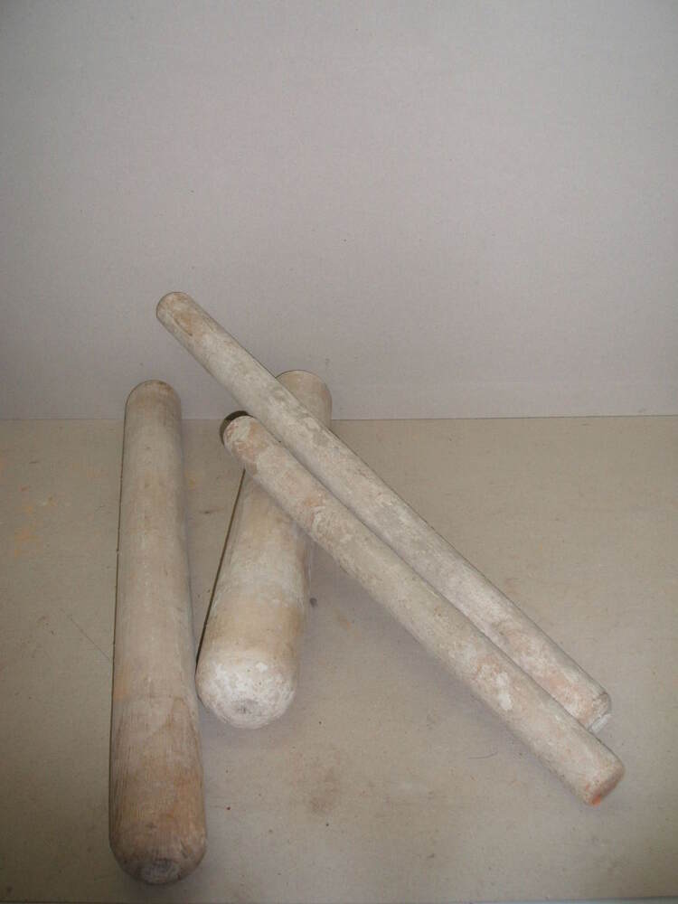 Rolstokken van verschillende lengte en dikte, voor het uitrollen tussen latten van een lap klei.
