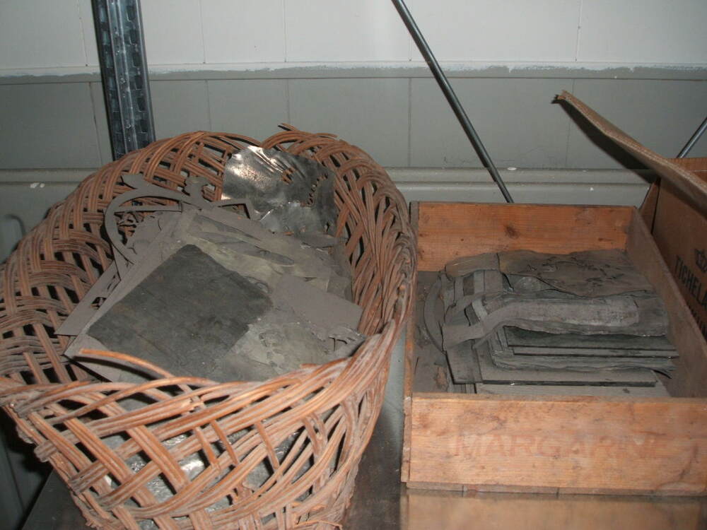 Sjablonen voor tegels, voor (halfmechanisch) decoreren. De meeste van de sjablonen zijn van zink en een aantal van staniol. De sjablonen zijn er in alle standaard tegelfomaten en er zitten er enkele tussen voor aardewerk. Per tegel werden meerdere sjablonen gebruikt. Het zijn in totaal 6 partijen sjablonen, een bakje met sponsen en een slijpsteen.