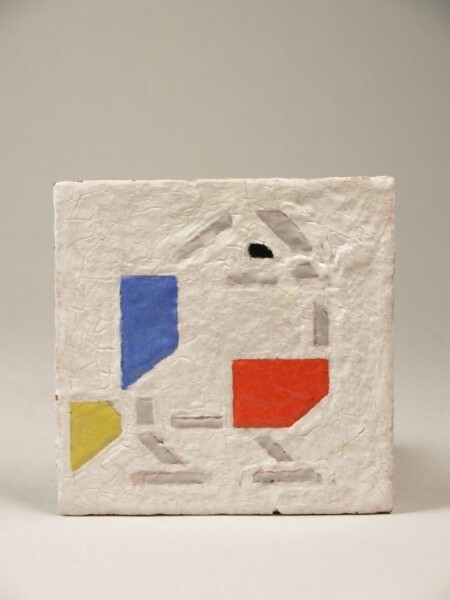 Scherf:rood. Vorm: vierkante tegel in houten standaard. Decor en glazuur: afbeelding van gestyleerde, abstracte vogel in de drie primaire kleuren met zwart en grijs op grijswit fond.