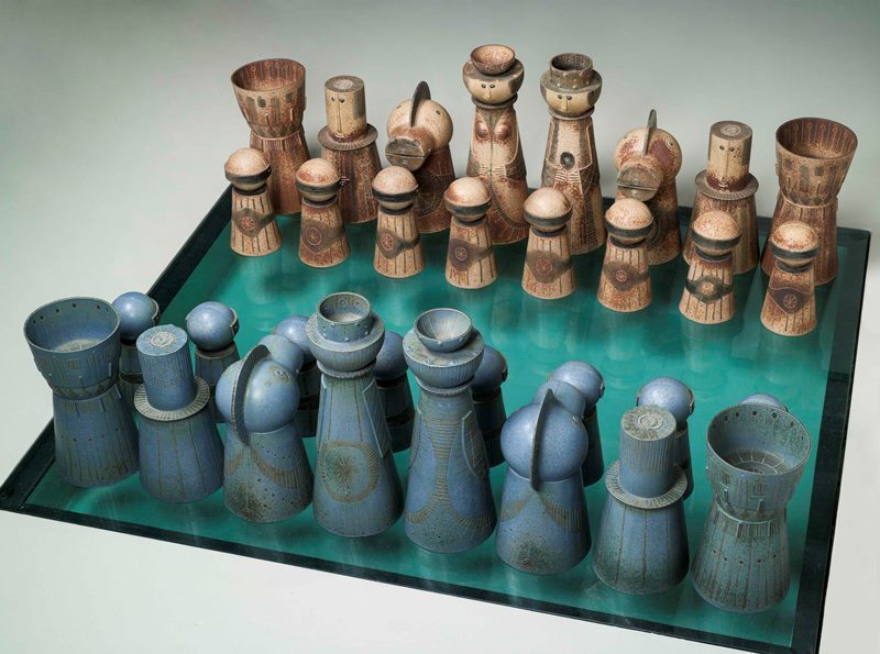 Schaakspel (32 stukken), blauw en bruin/geel glazuur, verpakt in zeven houten kisten.