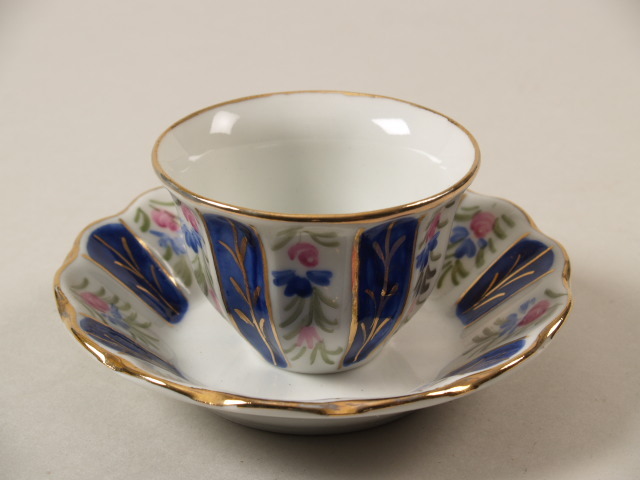 De decoratie in de vorm van afwisselend blauwe en witte vlakken met blad en bloemmotieven in goud, groen, blauw en rose. De randen van de schoteltjes zijn geschulpt en voorzien van een gouden bies.