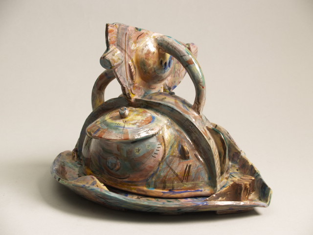 Kaasstolp bestaande uit 2 delen met abstracte vormen en decor in paars-blauw en groen-geel