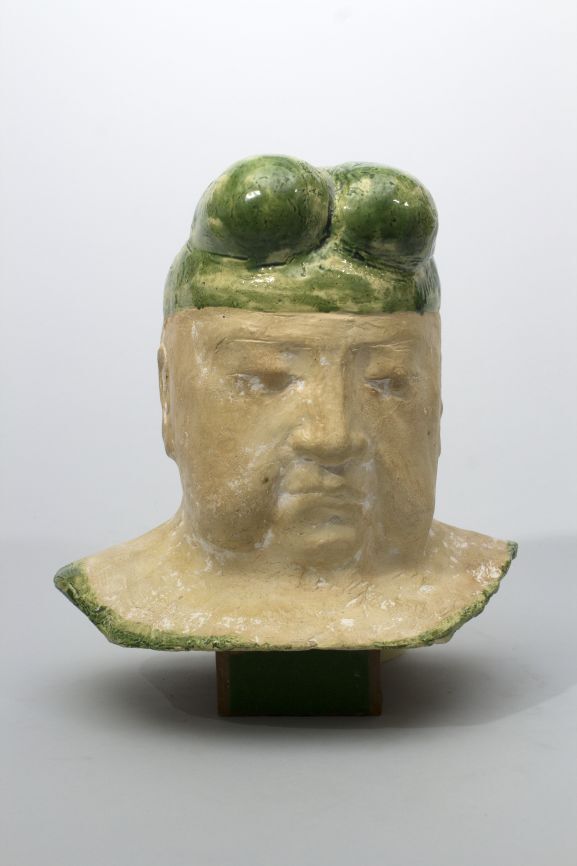 Portretbuste van keizer van China op sokkel. Beeld in de vorm van een mannenhoofd met groen hoofddeksel, voorstellende een Chinese keizer.