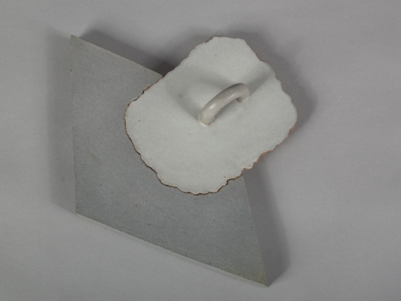 Grotendeels tweedimensionale kop en schotel, waarvan enkel het oor uitsteekt, in de kleuren licht- en donkergrijs.
