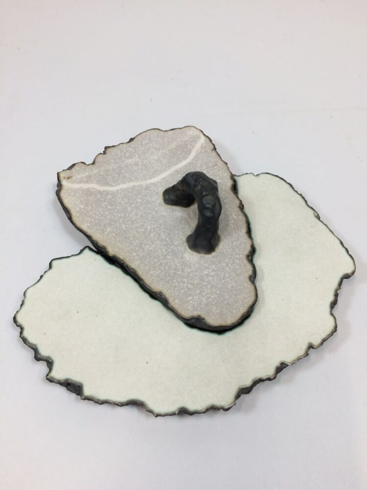 Grijze, grotendeels tweedimensionale kop en schotel, waarvan enkel het oor uitsteekt.