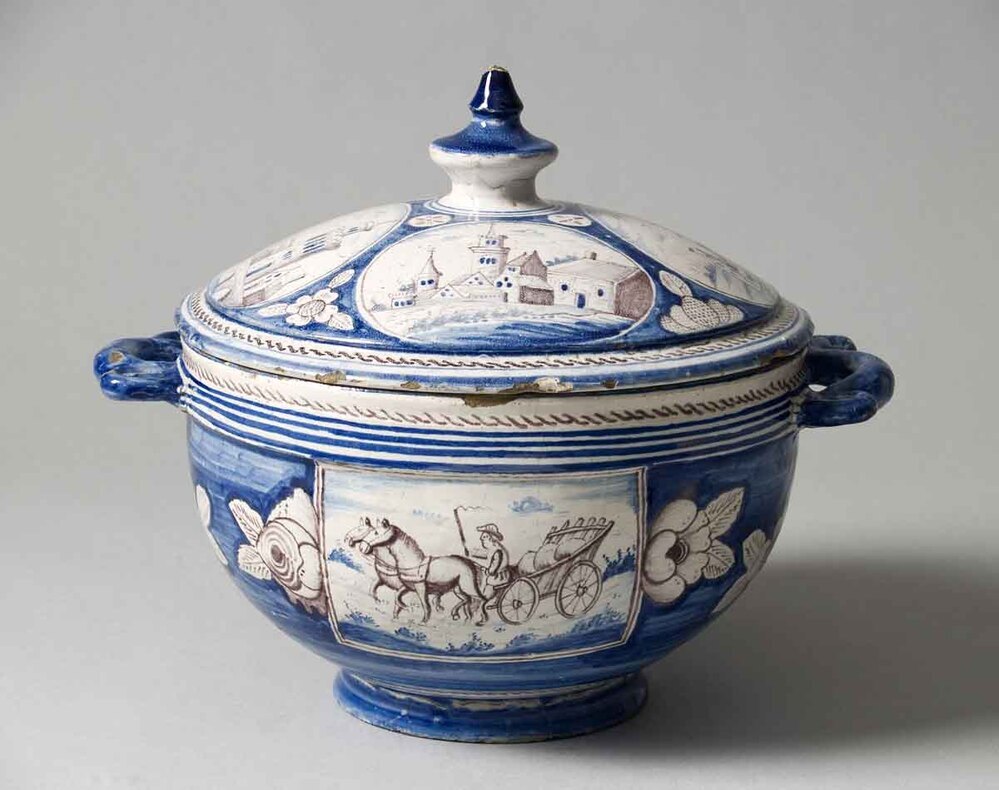 De terrine is komvormig en voorzien van twee oren en een bijhorend deksel. Het fond is blauw waarin twee vierkanten zijn uitgespaard die met een paarswitte bloemslinger met elkaar zijn verbonden. De vierkanten zijn beschilderd met afbeeldingen van een arreslee en een boerenwagen in paars en blauw. De enigszins verdikte bovenrand is voorzien van drie ...
