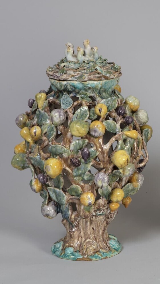 Balustervormige vaas met deksel, de voet in de vorm van een korte stam van waaruit een wirwar van lange twijgen met bladeren en vruchten (appels, peren, pruimen) het lichaam van de vaas vormt, de ranken zo ineengevlochten dat er onregelmatige openingen zijn ontstaan; het deksel in de vorm van een vogelnest waarin vijf jonge vogels ...