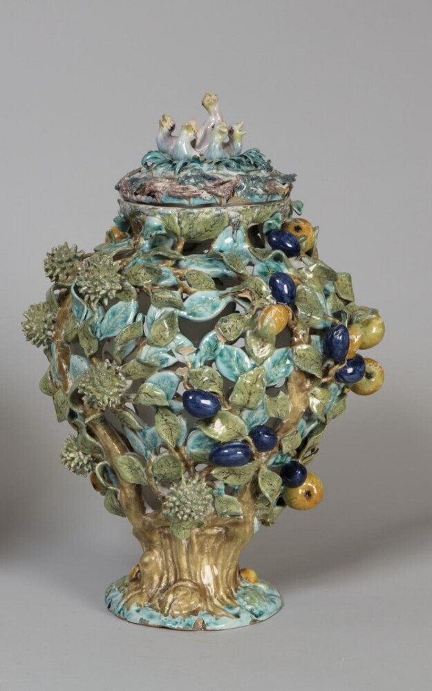 Dekselvaas in de vorm van fruitranken, met deksel in de vorm van vogelnest, veelkleurig beschilderd. Balustervormige vaas met deksel, de voet in de vorm van een korte stam van waaruit een wirwar van lange twijgen met bladeren en vruchten (appels, peren, pruimen, kastanjes) het lichaam van de vaas vormt, de ranken zo ineengevlochten dat er ...
