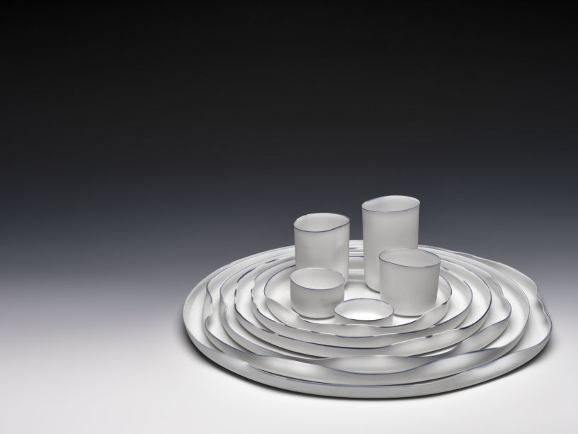 Set van 6 ronde platte schalen met onregelmatig gevormde lage wand en een vijftal cilindrische komvormen van verschillende hoogtes. Randen zijn aangezet met blauwe glazuurlijn. Binnenzijde bedekt met transparant glazuur