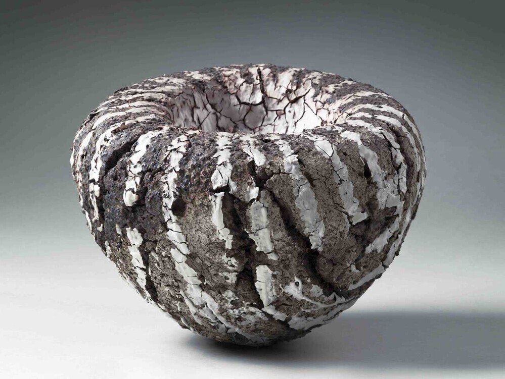 Bolvormig object met grove (korstige) textuur. Decor van witte lijnen. In de bol zit een uitholling van 16 cm diep